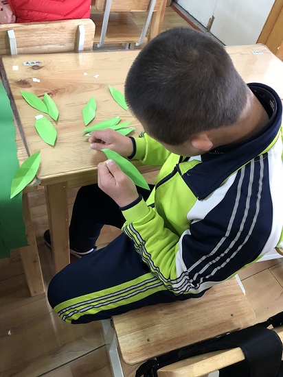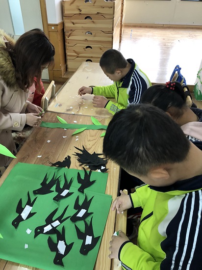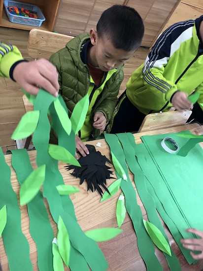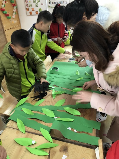 剪枝條、做樹葉、編柳條、粘燕子,又是一年春風(fēng)綠,小朋友們齊動(dòng)手,樓道轉(zhuǎn)眼便變美麗,大家一起哈哈笑。